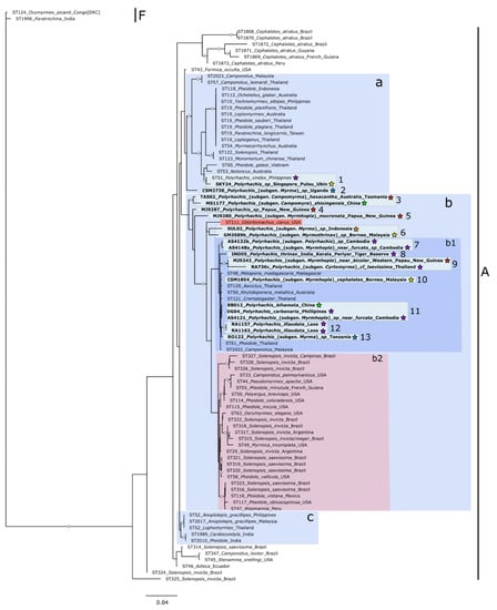 Only singly infected Polyrhachis samples (n = 34) were subjected to the Multilocus Sequence Typing (MLST) process wherein the five MLST genes (coxA, fbpA, ftsZ, gatB, and hcpA) were amplified and sequenced according to the same procedure as was done for the wsp gene. Since Sanger sequencing of multiple strains at once creates indecipherable electropherograms (due to the sequences for each strain overlaying each other), multi-infected Polyrhachis samples were excluded from the MLST process. Sequence alignments for each locus were created in Geneious Prime 2022.1 (https://www.geneious.com, accessed on 15 August 2022) then checked against reference sequences in the MLST online database (https://pubmlst.org/organisms/wolbachia-spp, accessed on 15 August 2022) to determine closest matching allele types. The closest matching sequence type (ST) for each Wolbachia strain able to produce clear electropherograms for all five loci (n = 20) was determined based upon these five alleles.
