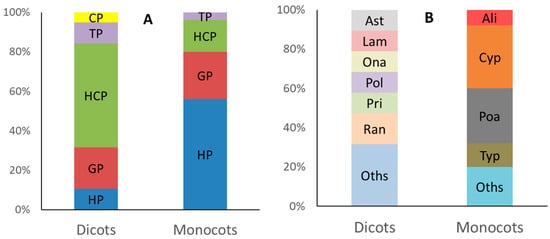 Ratios of life forms (A) (HP, helophyte; GP, geophyte; HCP, hemicryptophyte; TP, therophyte; CP, chamaephyte) and families (B) (Dicots: Ast, Asteraceae; Lam, Lamiaceae; Ona, Onagraceae; Pol, Polygonaceae; Pri, Primulaceae; Ran, Ranunculaceae; Oths, all other families in which only one species has been studied. Monocots: Ali, Alismataceae; Cyp, Cyperaceae; Poa, Poaceae; Typ, Typhaceae; Oths, all other families in which only one species has been studied) in the total sample of dicotyledonous and monocotyledonous wetland plant species studied.