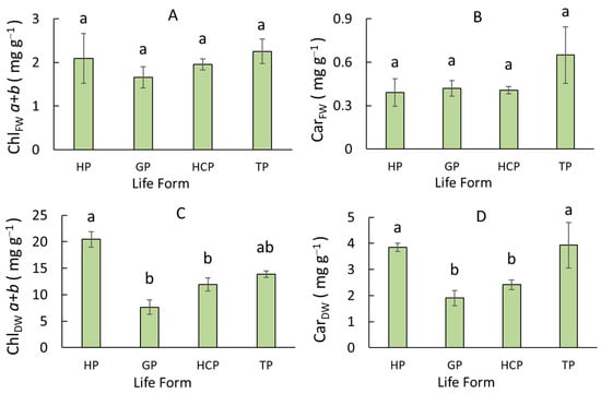 Considering the influence of factors on the variation in leaf pigment complex traits, the sampling site was not significant with respect to the dicots and monocots (Table S2). The type of family also did not affect the parameter values in the dicots, whereas the type of life form influenced certain traits, namely, ChlDW, CarDW, Chl a/b, Chl a+b/Car, and ChlLHC (Table 2). In the monocots, on the contrary, the type of life form did not have a significant effect, and the type of family influenced pigment complex parameters, such as ChlFW, CarFW, ChlDW, and CarDW.