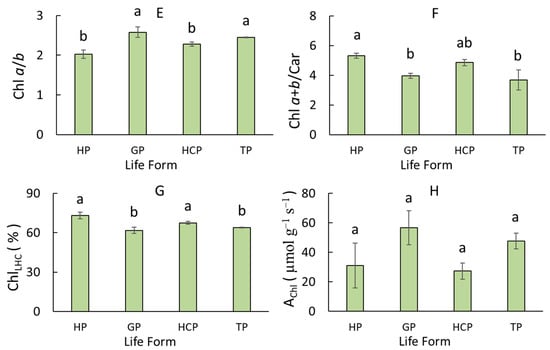 Leaf pigment complex traits in dicotyledonous wetland plants of different life forms (HP, helophyte; GP, geophyte; HCP, hemicryptophyte; TP, therophyte). (A) Chlorophyll and (B) carotenoid content per fresh weight. (C) Chlorophyll and (D) carotenoid content per dry weight. (E) Ratio of chlorophylls a and b. (F) Ratio of chlorophylls and carotenoids. (G) Proportion of chlorophyll in the light-harvesting complex. (H) CO2 uptake rate per unit of chlorophyll weight. Different letters indicate significant differences between life forms (p < 0.05). Error bars represent standard error (SE).