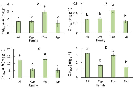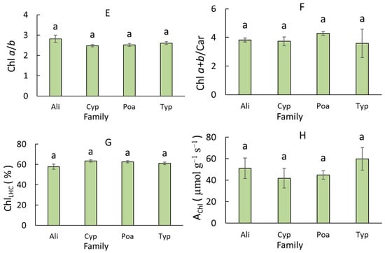 Among the monocotyledonous wetland plants, species of various families differed in terms of ChlFW, CarFW, ChlDW, and CarDW (Figure 3A–D). Species in the Poaceae family contained 1.7-fold greater ChlFW and CarFW compared to species in other families (Figure 3A,B). The ChlDW and CarDW in Cyperaceae and Typhaceae were about 2-fold lower than in Alismataceae and Poaceae (Figure 3C,D). The Chl a/b, Chl a+b/Car, ChlLHC, and AChl did not differ in various families (Figure 3E–H).