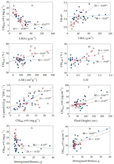 The relationship between (A) chlorophyll content per dry weight and LMA, (B) ratio of chlorophylls a and b and LMA, (C) proportion of chlorophyll in the light-harvesting complex and LAR, (D) proportion of chlorophyll in the light-harvesting complex and LAI, (E) chlorophyll content per dry weight and CO2 uptake rate per dry weight, (F) chlorophyll content per area unit and plant height, (G) chlorophyll content per dry weight and aboveground biomass, and (H) chlorophyll content per area unit and aboveground biomass. D—red, empty squares and dotted line represent dicots; M—blue, filled circles and a solid line denote monocots. Significance of correlation coefficient r: ns, not significant; *, p < 0.05; **, p < 0.01; ***, p < 0.001.