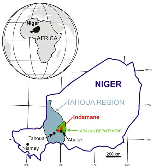 Geographical location of the paleontological area of the Indamane Mount (Abalak Department, Tahoua Region, Southwestern Niger), the type locality of the upper Maastrichtian (Upper Cretaceous) pleurodiran bothremydid turtle Abalakemys chapmanae gen. et sp. nov. Modified from Ref. [].