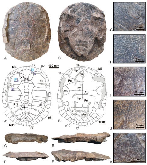 After a firsthand evaluation of the specimen, the carapace is described in detail. It is represented by photographs of the specimen in all six views, i.e., dorsal, ventral, anterior, posterior, right lateral, and left lateral views (Figure 2A–F). Furthermore, details of the outer surface of various regions of the carapace are also included in the same figure in order to show its ornamental pattern (see Figure 2G–K). Additionally, schematic drawings of the shell are included in the same figure in the dorsal and ventral views. The complete margins of the plates and scutes are represented in these drawings, as well as broken edges (see Figure 2A′,B′, in which the complete margins of the plates are represented by continuous black lines, the broken margins of the plates by dotted black lines, and the margins of the scutes by thicker gray lines).