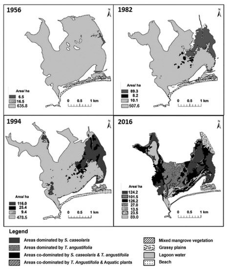 Maps of Kalametiya Lagoon showing spatio-temporal changes of vegetation over the last six decades (1956–2016). Eight considered habitat types are described in the legend, along with their respective patterns: (i) areas dominated by S. caseolaris (dark grey), (ii) areas dominated by T. angustifolia (grey with black spots), (iii) areas co-dominated by S. caseolaris and T. angustifolia (black), (iv) areas co-dominated by T. angustifolia and aquatic plants (white with two layers of black stripes), (v) mixed mangrove vegetation (white with one layer of black stripes), (vi) grassy plains (white with grass symbols), (vii) lagoon water (light grey), (viii) beach (white with black spots). When habitats are present in the map, corresponding area is added in ha on the side of the map. A scale in kilometres is presented under each map. Figure adopted from Madarasinghe et al. (2020) [11].