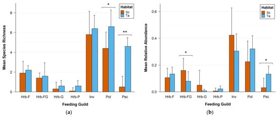 Comparison of (a) mean observed species richness and (b) mean relative abundance of the seven feeding guilds between the Sc and Ta habitats. For habitat and feeding guild labels, cf. Table 1. An asterisk represents a statistically significant difference between the two habitats (* for p-values < 0.05, ** for p-values < 0.01). Error bars represent the standard deviations.
