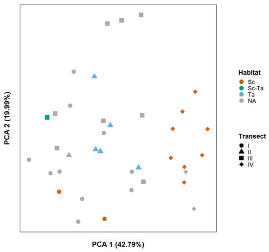 Out of the 37 sites sampled, 16 were affiliated to a specific habitat (i.e., Sc, Ta, Sc-Ta). Five sites, all from Transect II (i.e., ii2, ii3, ii4, ii5, ii6), were affiliated with the Ta habitat. Ten sites, from both Transect I and Transect IV (i.e., i7, i9, iv3, iv4, iv5, iv6, iv7, iv8, iv9, iv10), were affiliated with the Sc habitat. Only one site, from Transect III (i.e., iii6), was affiliated with the Sc-Ta habitat. As one site is not a statistically sufficient sample size, the Sc-Ta habitat was not included in most of the following analyses.