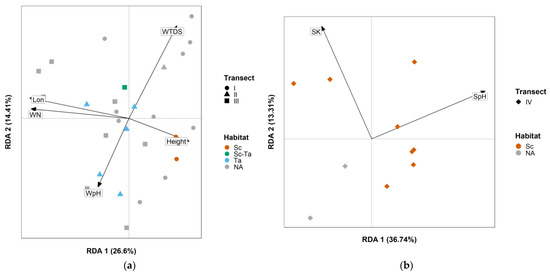 RDA ordination diagram for (a) Transect I/II/III and (b) Transect IV, linking Kalametiya Lagoon environmental variables and feeding guild composition among study sites. They use the two first ordination axes, RDA 1 and RDA 2, displayed on the left and bottom sides of each figure with their explained proportion in percentages. For habitat labels, cf. Table 1, except for NA, which is used for sites with no habitat affiliation. The shape of the dots displays transect affiliation: circle for Transect I, triangle for Transect II, square for Transect III, and diamond for Transect IV. Labels for environmental variables are: Lon = longitude, WN = water nitrate content, WTDS = water total dissolved solids, WpH = water pH, Height = mean tree height, SK = soil phosphate content, SpH = soil pH.