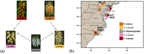 Within Platanthera, species in subgenus Blephariglottis sect. Blephariglottis [31] demonstrate strong floral radiation [32,33]. The Orange Fringed orchid, P. ciliaris (L.) Lindl, the Crested Orange Bog orchid, P. cristata (Michx.), and the White Fringed orchid P. blephariglottis (Willd.) Lind. have a wide distribution and overlap in several regions throughout the Eastern United States between New England and Florida and as far west as Texas [34,35]. The three parent species are found in sphagnum bogs, pine savannas, meadows, and prairies, with the habitats of P. ciliaris being particularly varied [34]. The specificity of two key biotic interactions, orchid mycorrhizae and pollinators, may constrain parent species distributions and generate parapatric boundaries between populations of species. While a range-wide analysis of pollinator fauna is missing for the subgenus Blephariglottis, studies have identified swallowtail butterflies (Papilio spp.) as pollinators of P. blephariglottis and P. ciliaris and bumblebees (Bombus spp.) as the predominant pollinator of P. cristata and an occasional pollinator of P. blephariglottis [34,36,37,38,39,40]. Partial overlap in pollinators and flower morphology may facilitate occasional cross-pollination events and interspecific gene flow [32]. The distribution of specific mycorrhizal fungi partners impacts the distribution of parent species and whether hybrids can establish [15]. Preliminary explorations of mycorrhizal diversity in P. ciliaris, P. cristata and P. blephariglottis have shown the three species to associate primarily with fungi in the genus Tulasnella [41,42,43], and an overlap in appropriate fungi might support the post-zygotic success of hybridization in sites of colocalization. In sites with species overlap, pairs of the three parent species have been observed to form putative hybrids with intermediate morphology [32]. Here we studied the putative crosses of P. blephariglottis with P. cristata to form P. x canbyi [33] and with P. ciliaris to form P. x bicolor [24] (Figure 1a). We analyzed sympatric sites where the hybrid’s parent species co-occurred, sympatric sites where orange parent species co-occurred and P. blephariglottis was previously observed, and allopatric sites where a single parent species occurred (Figure 1b). Out of the ten sites studied, we found putative hybrids for P. x bicolor in Central Pennsylvania as well as coastal North Carolina, and P. x canbyi on the eastern shore of Maryland as well as New Jersey.