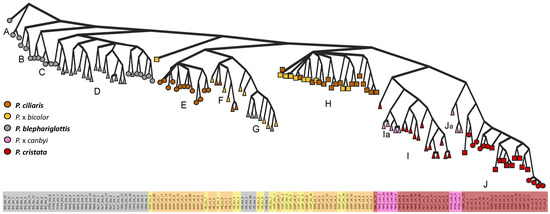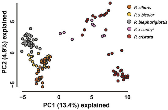 We found significant differences among species in flower morphology when we conducted a multivariate Permanova analysis of the combined traits (p < 0.001) and observed strong clustering in dimension reduction analyses (Figure S2) [32]. The putative parent species, P. blephariglottis, P. ciliaris, and P. cristata, clustered independently. The measured floral traits from the putative hybrids, P. x bicolor and P. x canbyi, clustered between the appropriate parent species. Moreover, the two principal components described 73.8% and 17.8% of the variance in flower morphology (Figure S2). The sub-complex of P. blephariglottis, P. ciliaris, and its hybrid P. x bicolor maintained morphological similarity (Figures S1–S3).