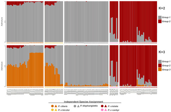 Population structure of Platanthera taxa. Every SNP is assigned a probability of belonging to ancestral populations (K = 2 or K = 3) represented by gray, red, or orange. Assignments are summarized in a single bar. Below each bar is a symbol where color represents the field assigned species name, P. blephariglottis (gray), P. ciliaris (orange), P. cristata (red), P. x canbyi (pink), and P. x bicolor (yellow), and shape represents whether one (circle) or two (triangle) parent species were present at the site.