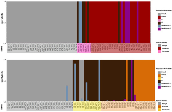 We used NewHybrids to assign hybrid categories with posterior distributions from a Bayesian model-based clustering framework [61]. First, we re-sorted the demultiplexed files from iPyrad step 1 into two sets. One set contained P. x bicolor and its respective parent species (P. blephariglottis and P. ciliaris). The second set contained P. x canbyi and its respective parent species (P. blephariglottis and P. cristata). We re-ran steps 2–7 of the iPyrad pipeline using the adjusted parameters explained previously. The P. ciliaris set (n = 92) contained 4443 loci and the P. cristata set (n = 84) contained 4927 loci. We implemented Fst analyses with hybriddetective to filter the variants into the 300 maximum allowed by NewHybrids to focus on the most informative loci between the two parent species [62,63]. We converted the VCF file generated in iPyrad into a genepop file using PGDSpider with a population definition file that assigned the parent species to either Pop1 or Pop2 under the assumption that loci informative across parent species would be informative for the hybrids. We converted the Fst selected loci from a VCF file to a NewHybrids input file using PGDSpider [64] and generated hybrid assignments in parallelnewhybrids with a burn-in of 1 iterations, a sweep of 4 , and Jeffrey’s theta and Pi priors [61,63,65,66].