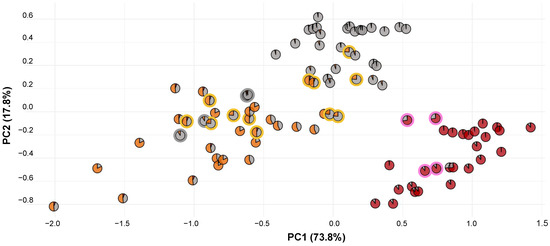 PCA of floral morphology for genetically-identified Platanthera species. Each sample point shows a pie chart generated based on population structure data for the individual sample or an average of the same samples in that particular site due to discordance between the samples analyzed genetically and those analyzed morphometrically. For clarity, we circled the putative hybrids (pink and yellow) and the P. blephariglottis samples that clustered with P. ciliaris morphometrically (gray).