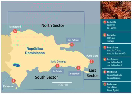 We established 12 coral reef monitoring sites, distributed among 6 regions from near the southern border with Haiti to the eastern-most region to near the northern border with Haiti (Figure 1). All sites had well-developed coral reefs that were used for diving and fishing. Most coral reefs were well-developed bank-barrier reefs. Most unique were those at the Montecristi region, where reef development was 10 km from the shore.