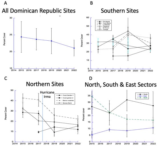 Trends in coral cover from all DR sites (A), in the south (B), and in the north (C). Data from North, South, and East Sectors show strong and protracted declines in coral cover in the North Sector (D).