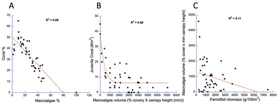 Support for strong drivers that limit the abundances of important components of the DR’s coral reef ecosystems. Coral cover (A) and juvenile coral density (B) were limited by macroalgae cover (N = 180, 10 m transects, N = 895, 625 cm2 quadrats, respectively) and macroalgae limited by parrotfish abundance N = 360, 120 m2 belt transects (C). Data pooled from all surveys from all years.