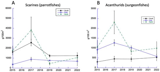 Given the importance of parrotfishes as herbivores, their trends are most important. Parrotfish (Labridae: Scarinae) abundance was greatest in the North and South Sectors in 2015 and 2017 but declined by 2019 and remained relatively low during 2022 (Figure 4A). A similar pattern was reported for another important family of herbivores: the surgeonfishes (acanthurids) (Figure 4B).
