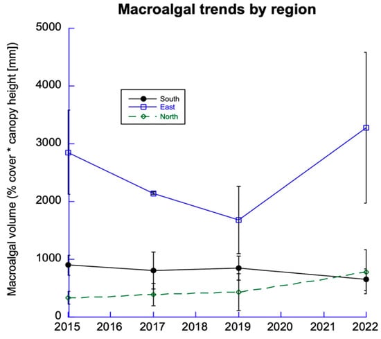 Trends in macroalgae. Data from 12 sites among 6 DR regions from the 3 sectors.