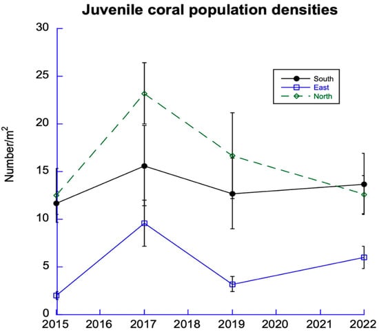 Juvenile corals are important for the recovery of damaged coral reefs. While there has been no net change in the abundance of juvenile corals since 2015 in the East and South Sectors, the North Sector has shown a consistent decline since 2017 (Figure 6).