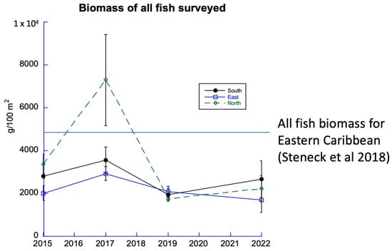 Biomass of all fish from all transects, 2015 to 2022. The horizontal line illustrates the biomass of all fish surveyed for the Eastern Caribbean [6].