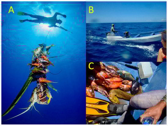 (A) Observed spearfishing in the Montecristi Region March 2015. (B) Fisher with a hookah rig for supplying air to divers. (C) An afternoon’s catch of mostly parrotfish. Photographs by Jose Alejandro Alvarez.