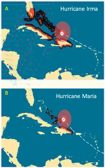 The hurricane tracks for (A) Hurricanes Irma (7 September 2017) and (B) Maria (21 September 2017).