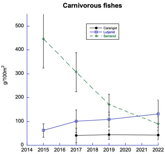 Carnivorous fishes include carangids (jacks), lutjanids (snappers), and serranids (seabass). All were low in abundance, but serranids have declined the most since 2015.
