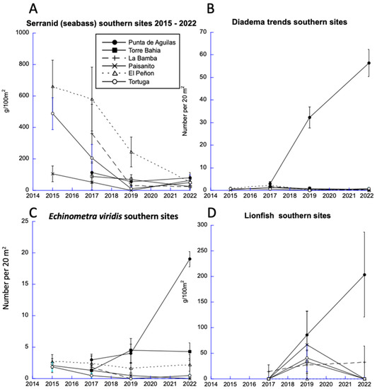 Trends in seabass (Serranidae such as groupers, coney, and graysby) abundance and their potential prey across all years: (A) changes in seabass abundance for all southern sites (note that Punta Aguilas had low seabass abundance all years of monitoring), and (B,C) Diadema and Echinometra viridis and (D) lionfish.