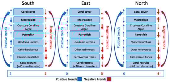 Trends in major coral reef drivers (good condition or positive on left in blue; poor condition or negative on right in red) were evaluated using the monitoring protocol from [25]. Most important reef characteristics are in boldface. North Sector DR reefs were clearly trending most negatively, possibly because of multiple stresses (coral bleaching, hurricanes, and overfishing).