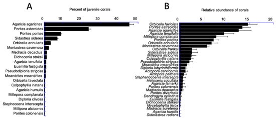 Relative abundances for juvenile (A) and adult (B) coral species. Juvenile (N, 20 spp.) and adult (N, 30 spp.) coral averages are for all sites and all years.