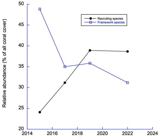 The composition of the DR’s coral reefs is changing. The juvenile corals are dominated by the relatively flat lettuce and mustard corals (Agaricia agaricites and Porites astreoides; Figure 13 left), whereas the single-most abundant adult coral is the star coral Orbicella faveolata (a coral reef framework species) (Figure 13, right). All coral species from the juvenile coral quadrats and the adult coral transects show a declining shift in the relative abundance of framework species and the increasing recruitment of weedy (juvenile) coral species (Figure 14). Corals that recruit readily reach reproductive maturity relatively quickly but lack vertical structure and are operationally called weedy corals (sensu [26]). As a result, the structure of the DR’s reefs may be becoming increasingly flat and, therefore, lacking habitat for reef fish and recruiting corals [20].
