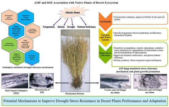 Nonetheless, there is substantial evidence to indicate that AMF support host plants against various abiotic stressors such as drought [,] and other environmental stresses, i.e., heat, salinity, metals and extreme temperatures [,]. Li et al. [] suggested that soil microbes such as AMF often regulate plant growth response to drought stress and alleviate drought damage via increasing photosynthesis, and antioxidant enzyme activities and reducing levels of malondialdehyde (MDA) in drought conditions. Colonization of these AMF can also stimulate various physiological responses to drought stress including stomatal conductance sensitivity, CO2 assimilation, and decreases in relative water content; further, leaf water potential is likely to be improved by AMF inoculation [,]. A schematic representation of potential mechanisms mediated by AMF and dark septate endophytes (DSEs) to regulate drought stress tolerance and improve desert plants’ performance and adaptation is shown in Figure 1.