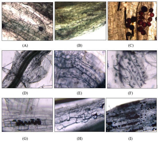 Pictures showing different structures of AMF and DSE colonization observed in root system of native desert plants of Kuwait. Vesicles observed in summer root samples of Acacia pachyceras (A), Panicum turgidum (B) and Pennisetum divisum (C). AMF arbuscules in winter root samples of Cyperus conglomeratus (D), Pennisetum divisum (E), Stipa capensis (F). Microslerotia clusters of DSE in Rhanterium epaposum (G), DSE hyphae in Plantago boisseri (H), Microsclerotia/resting spores of DSE in Stipa capensis (I). All these structures were observed under compound microscope. Source images: Quoreshi et al. [].