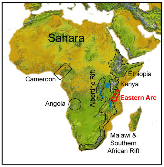 Africa’s montane forests are scattered discontinuously along a 5000-km series of mountains running from the Ethiopian Plateau in the north to the South African coast. Two isolated montane highlands occur to the west: the Angolan Highlands and the Cameroon Highlands [1,2,3] (Figure 1). The fragmentary distribution of montane forest across these regions is primarily a consequence of relief; only a few isolated areas are high enough (>1800 m) for the development of a montane climate, which also requires the low temperature and high precipitation often created by orographic rainfall [4,5]. Some of the forest sky islands are within sight of each other, whereas others are separated by hundreds of kilometers. The intervening dry lowland plant communities appear to serve as a barrier to the dispersal of montane species whose breeding ranges are presently confined to these mountainous highlands [1,2,6,7,8]. The montane habitats of Africa are thus, in effect, ecological islands, analogous to other continental sky island systems around the globe (e.g., the Western Ghats of India [9]; the Madrean Sky Islands of the Southwestern United States of America [10].