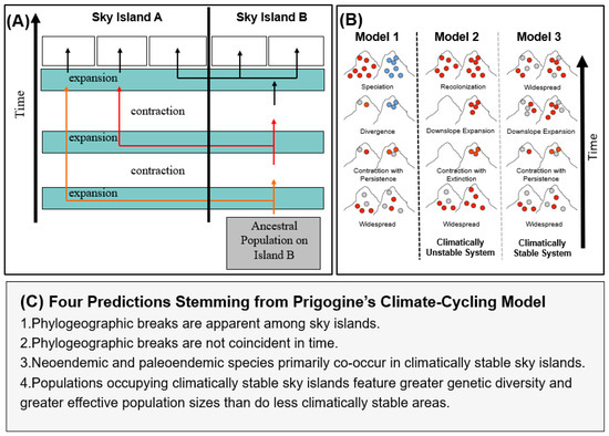 (A) Climatic cycling model of forest expansion and contraction proposed by Prigogine [6] and extended by Vrba [18]. Under this model, both dispersal and vicariance have played important roles in shaping montane bird communities. (B) Model 1: A graphical depiction of speciation, resulting from climate cycles, driving the expansion and contraction of forests in accordance with Priogone’s model. During forest contraction, sky island populations are isolated, and then, through drift or selection, different genotypes are selected for in each highland, resulting in the blue genotype no longer being reproductively compatible with the red or gray genotypes. Models 2 and 3: the influence of local extinction on species richness and genetic diversity. In Model 2, forest is lost from the left sky island during a climate cycle, resulting in the local extinction of forest-associated lineages. Upon expansion of forest during climatically favorable conditions, the left sky island is recolonized, but genetic diversity (the gray genotype) is lost. Using the nomenclature in this paper, the left sky island would be unstable and the right stable, where stability refers to the persistence of a suitable habitat through time. In Model 3, both the left and right sky islands retain suitable habitat through climate cycles, resulting in the retention of greater genetic diversity and larger effective population sizes, but in contrast to Model 1, speciation does not occur due to the lack of reproductive isolation upon secondary contact when the forest expands once more during climatically favorable conditions. (C) Predictions stemming from Prigogine’s model tested in this paper.