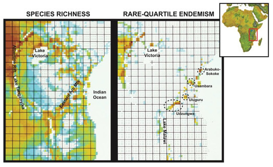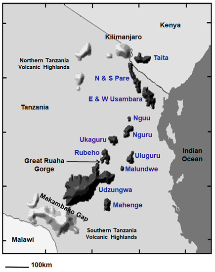 - Burgess, N.D.; Butynski, T.M.; Cordeiro, N.J.; Doggart, N.H.; Fjeldså, J.; Howell, K.M.; Kilahama, F.B.; Loader, S.P.; Lovett, J.C.; Mbilinyi, B.; et al. The biological importance of the Eastern Arc Mountains of Tanzania and Kenya. Biol. Conserv. 2007, 134, 209–231. [Google Scholar] [CrossRef]