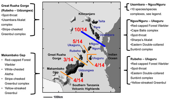 Comparative phylogeography of 14 co-distributed forest-dependent bird lineages distributed across the Eastern Arc Mountains of Africa. Members of 10 of the 14 species complexes exhibit a phylogeographic break between the Usambara and Nguu/Nguru Mountains (detailed in Figure 6). This is the largest lowland habitat barrier (125 km) between sky islands in the Eastern Arc.