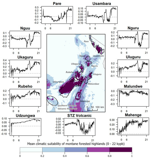 Predicted climatic suitability of montane forested highlands in the Eastern Arc Mountains of Tanzania (excl. the small montane area in the Taita Hills in SE Kenya). The map reports the mean climatic suitability over the past 22,000 years, by century. Time series plots for each mountain range or highland depict the anomalies in mean climatic suitability (y axes) in the defined polygons over the same time period (x axes) in thousands of years before present (kybp), with values 0, 6 (roughly mid-Holocene), and 21 (roughly Last Glacial Maximum) provided as references. The dashed gray line in each plot reflects no change relative to the 20th century. Positive values represent increasing climatic suitability, while negative values represent decreasing suitability compared to the 20th-century baseline. The plot labeled “STZ Volcanic” corresponds to the Southern Tanzania Volcanic Highlands on the map.