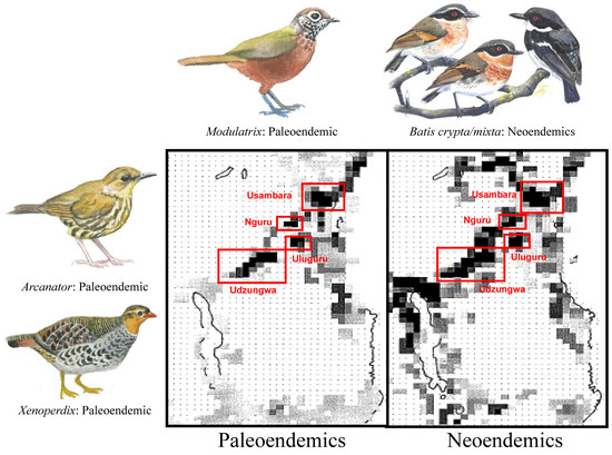 Richness maps for 31 bird species whose branch-lengths date back to the Pliocene (paleoendemics) or earlier and for 97 lineages (allospecies) that diverged during the Pleistocene (neoendemics). Darker pixels indicate greater richness. Three paleoendemic lineages of the Eastern Arc Mountains are illustrated: the Udzungwa Forest Partridge (Xenoperdix udzungwensis); the Dapple-throat (Arcanator orthostruthus); and the Spot-throat (Modulatrix stictigula). The single neoendemic lineage is a newly described bird species from East Africa [47], the Dark Batis (Batis depicted crypta), and its sister-taxon, the Forest Batis (B. mixta), both of which have traditionally formed part of the Cape Batis (B. capensis) species complex. The paintings are by Jon Fjeldså.