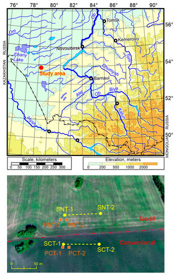 The research was conducted in West Siberia in the southern part of the forest steppe zone, near the natural bioclimatic boundary of the steppe zone (53.82° N, 79.24° E). Administratively, the area belongs to the Krasnozerskiy district of the Novosibirsk region. Agricultural use of the territory (plowing of previously undisturbed meadow ecosystems and subsequent tillage in the traditional way, i.e., moldboard tillage to the depth of 20–25 cm) began in around 1930 (Figure 1).
