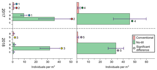 Mean earthworm abundance per square meter in CT and NT plots. (Left): by species (a: Eisenia nordenskioldi (mature), b: Eisenia nordenskioldi (immature), c: Eisenia fetida (immature). (Right): overall density of earthworms. Standard error is shown by whiskers. Stars of one color with same figures show the significant difference between certain parameters.