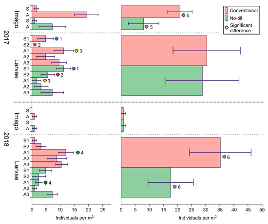 Density distribution of adults and larvae of click beetles (Coleoptera, Elateridae) in CT and NT plots. (Left): by species (S1, Selatosomus aeneus; S2, Selatosomus latus; A1, Agriotes sputator; A2, Agriotes lineatus; A3, Agriotes obscurus). (Right): overall density of Elateridae. Standard error is shown by whiskers. Stars of one color with same figures show the significant difference between certain parameters.