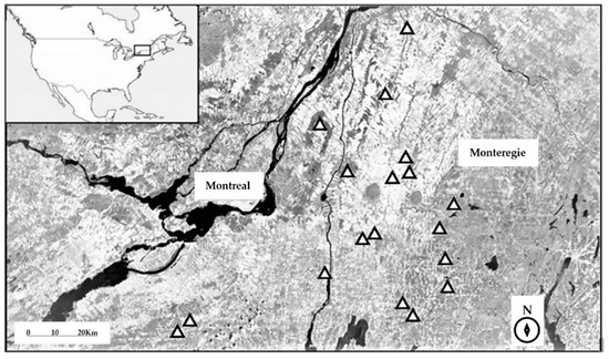 Distribution of highbush blueberry fields sampled in Montérégie region in Quebec, Canada. Triangles indicate the location of study sites.