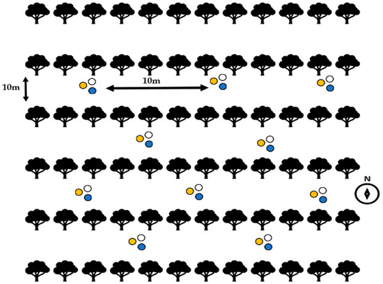 Schematic representing the deployment of sampling stations with pan trap triplets (white, yellow, and blue), at a highbush blueberry field. Distance between stations along a given row is 10 m, the same distance separates each row.