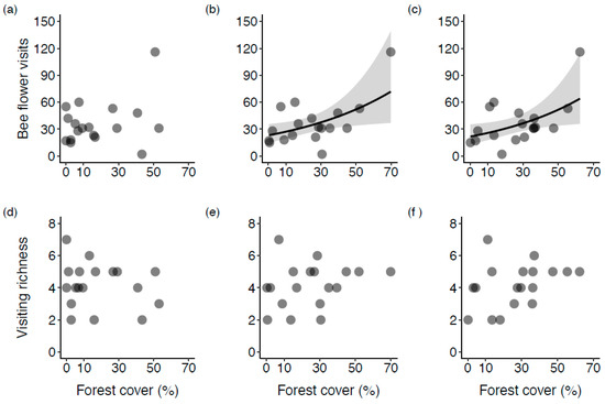 The relationship of wild bee flower visits (a–c) and visiting richness (d–f), as a function of the proportion of forest land cover habitat at 500 m, 1000 m, and 2000 m scales (from left to right) at the sampled highbush blueberry fields in Montérégie, Canada. Models for bee flower visits are Negative Binomial regressions whereas models for visiting richness are Poisson regressions. Grey area represents confidence intervals. Only statistically significant fitted lines are plotted.