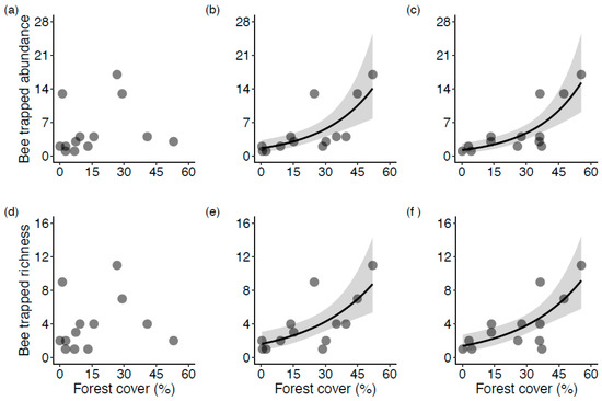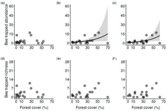 The relationship of wild bee trapped abundance (a–c) and trapped richness (d–f), as a function of the proportion of forest land cover habitat at 500 m, 1000 m, and 2000 m scales (from left to right) at the sampled highbush blueberry fields in Montérégie, Canada. Models for trapped abundance and trapped richness are Negative Binomial regressions. Grey area represents confidence intervals. Only statistically significant fitted lines are plotted.
