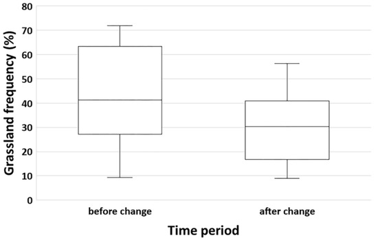 Land use patterns in EIE were subject to significant transformation, creating a large decrease in grasslands, both for individual territories and as a whole (adjusted R2 = 0.84, β2 = −0.34, CL: −0.18/−0.50) (Table 1). While before landscape transformation, the mean percentage of grasslands in our focal territories was 42.42 ± 21.57, after the plowing, their mean share dropped to 29.1 ± 13.99 (Figure 2). The territories lost an average of 25.79% of their grassland habitats. The most transformed territory had its grassland habitat reduced by 51.55%, and one-third of the territories had lost an average of 41.78% of their pastures. Out of all 15 studied territories, only one recorded an increase in the area of grassland in the second period, by 3.24%.
