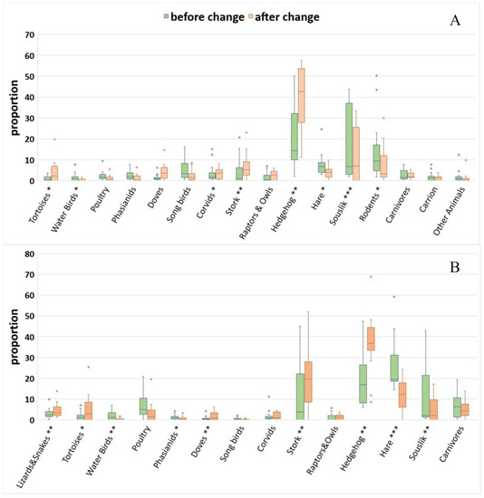 Dynamics of the different prey categories (frequency, (A) and biomass, (B)) during the two studied periods (before change: 2001–2010; after change: 2012–2021). * Significant values; ** Highly significant values; *** Very highly significant values.