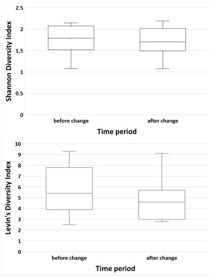 Dynamics of diversity indexes of habitat (Shannon’s) and diet (Levin’s) in Eastern imperial eagle territories in the two studied periods (before change: 2001–2010; after change: 2012–2021).