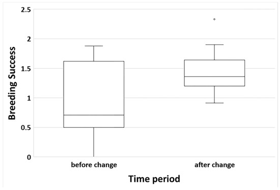 In general, the breeding success significantly increased in the period after grassland alteration (adjusted R2 = 0.18, β2 = 0.47, CL: 0.83/0.11), without a “territory effect” affecting this process (Table 1) (Figure 5). The mean success of reproduction in the years before habitat transformation was 0.97 ± 0.60 fledglings per incubating pair. In the period after grassland alteration, the mean breeding success of eagles grew to 1.45 ± 0.37.